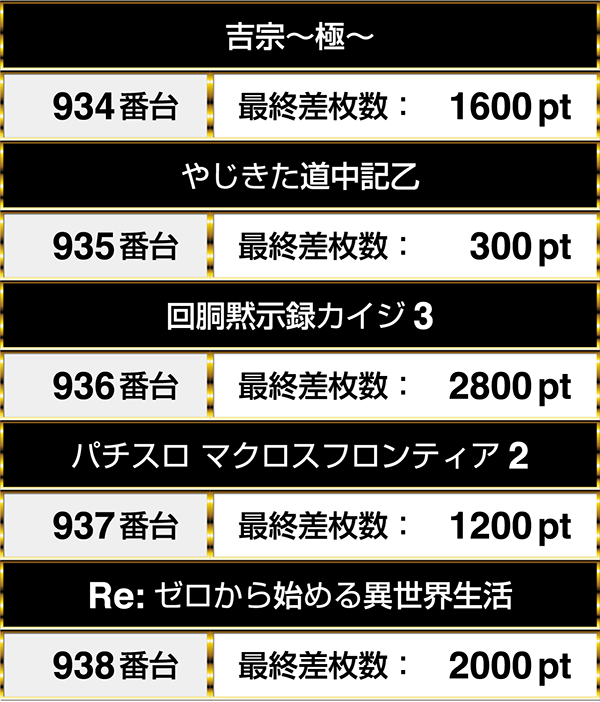 バラエティコーナーでは、『吉宗~極~』の934番台から『Re:ゼロから始める異世界生活』の938番台までの5台が連なってプラスpt!