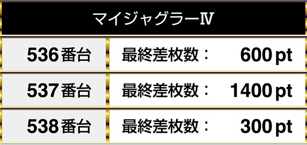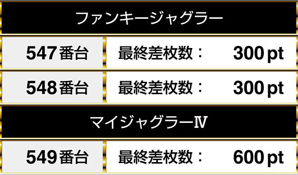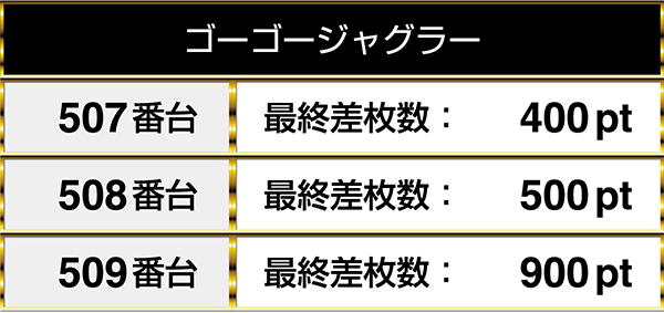 ほかにも、『マイジャグラーⅣ』や『ゴーゴージャグラー』など、プラスptが並ぶ場所がいくつもあった。