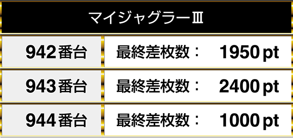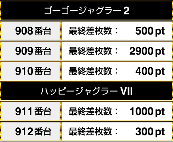 2000ptオーバーの台があった『ゴーゴージャグラー2』は3台が固まってプラスpt!!