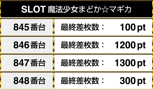 閉店時のデータでは『SLOT魔法少女まどか☆マギカ』の4台が並んでプラスptとなり、2台が1000ptオーバー!