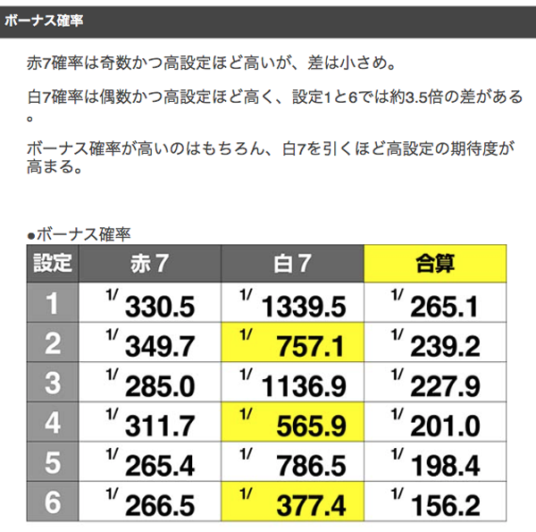 ボーナス合算確率は高設定ほど高い。白7確率は偶数かつ高設定ほど高く、設定1と6では約3.5倍の差がある。