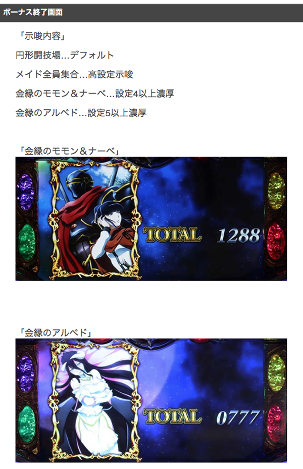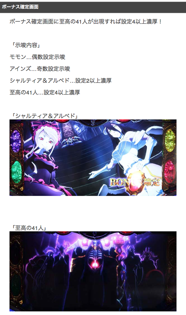 ボーナス確定画面ではシャルティア&アルベドが出現すると設定2以上、至高の41人なら設定4以上が濃厚だ。