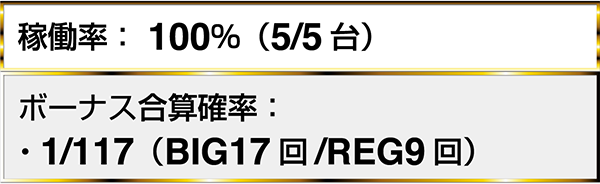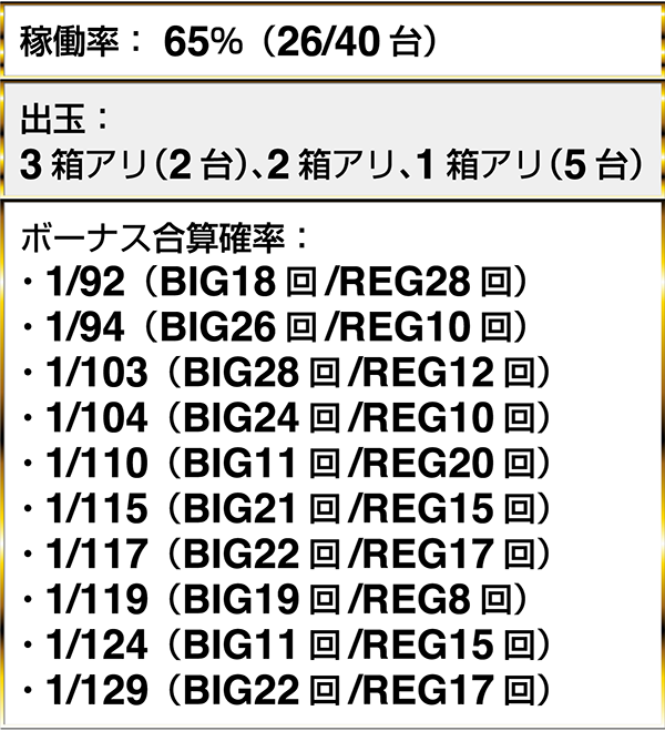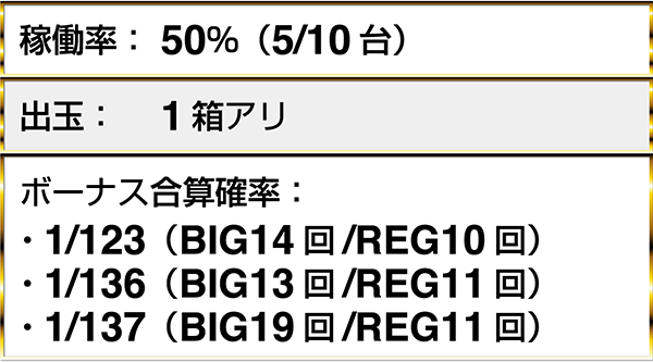 『ゴーゴージャグラー』や『ファンキージャグラー』など、3機種以上のジャグラーシリーズでボーナス合算確率が1/130を上回っているデータを目にした。