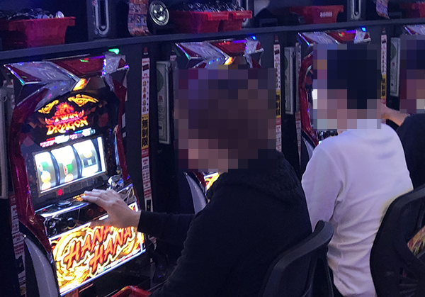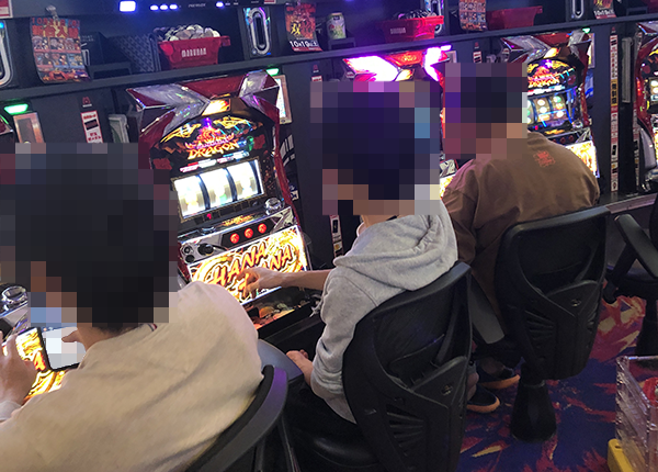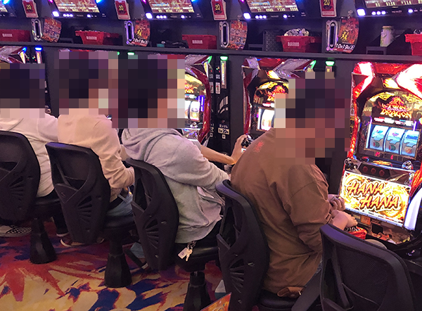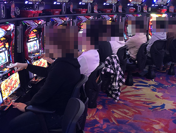 パチスロコーナーに足を踏み入れ、目に飛び込んできたのはたくさんのプレイヤーが遊技をおこなっている光景。スペックを問わずにさまざまな機種が支持されており、盛り上がりはとても大きかった。