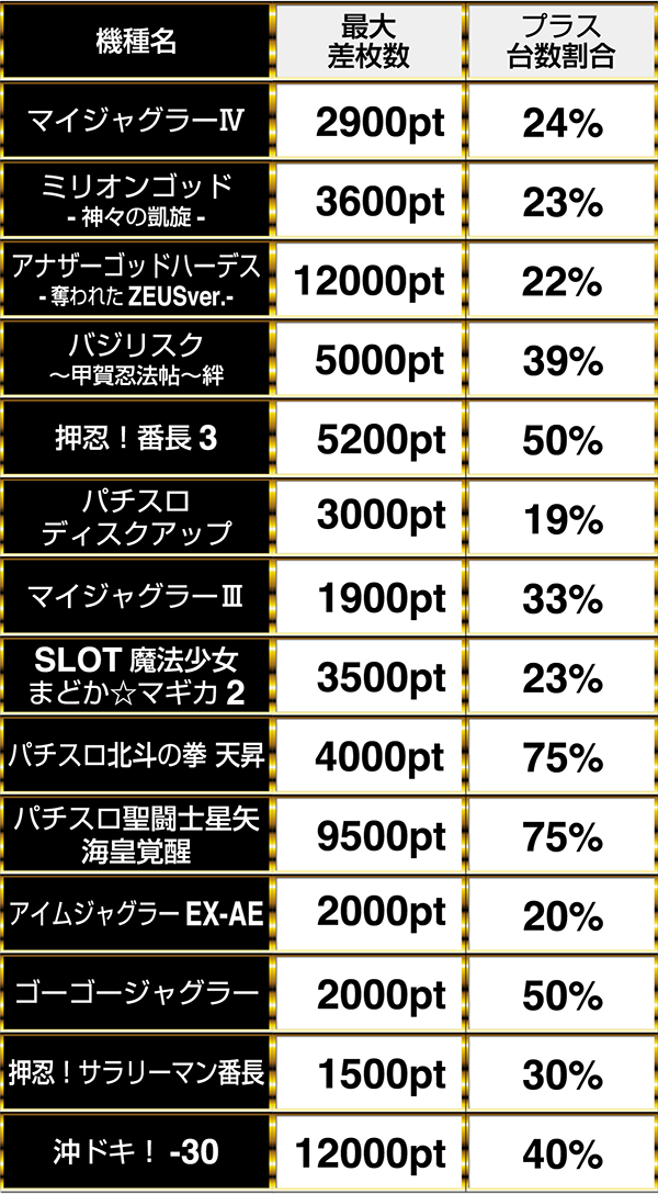 『アナザーゴッドハーデス-奪われたZEUSver.-』と『沖ドキ!-30』のなかには、10000ptを上回る台もあった。