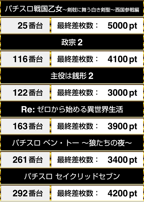 閉店時には『パチスロ ベン・トー 〜狼たちの夜〜』や『Re:ゼロから始める異世界生活』の163番台など、3000ptを上回る台が多数!!