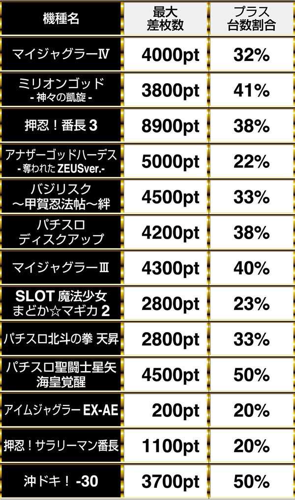 『ミリオンゴッド-神々の凱旋-』と『マイジャグラーⅢ』は4割以上の台がプラスpt!