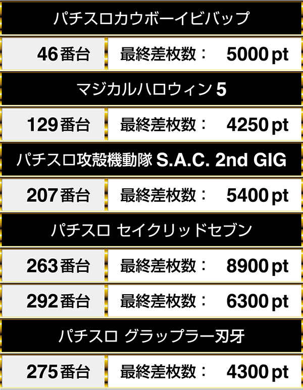 『パチスロ グラップラー刃牙』は4000ptを上回り、『パチスロ攻殻機動隊S.A.C. 2nd GIG』の1台は5000pt以上を記録した。