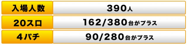 20スロ全体では、380台中162台がプラスで、トータルの差枚数が+83枚だった。