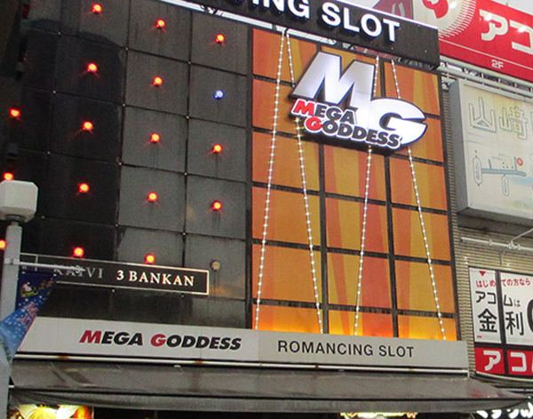 舞台となったのはパチスロ専門店の「MEGA GODDESS」。派手なオレンジ色や大きなモニターがついている外観も特徴的なホールだ。