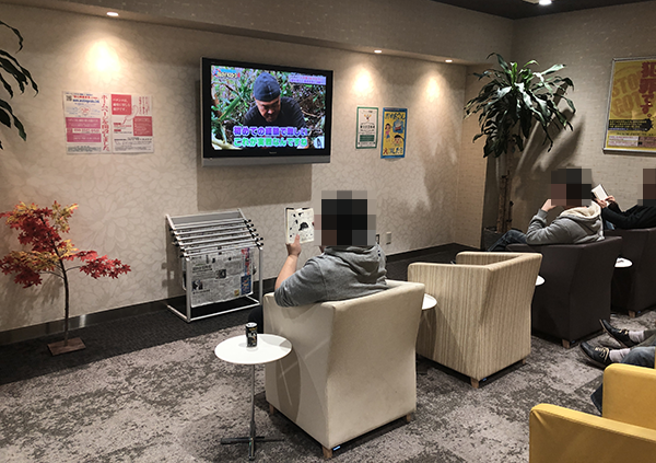落ち着いた雰囲気のレストスペースには、ひとりがけのソファが用意されている。漫画本やテレビもあるため、気分転換などに利用してもよさそうだ。