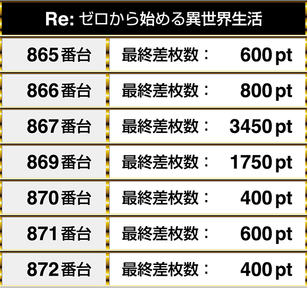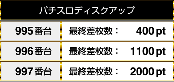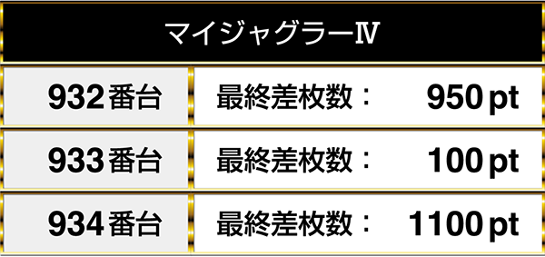 閉店時のデータでは、どちらの機種も3台並びでプラスptを記録。6台中3台が1000ptを上回っていた。
