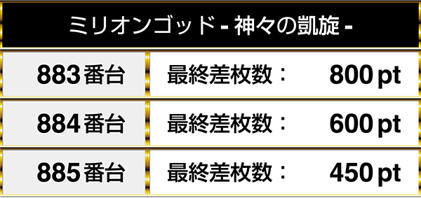 『ミリオンゴッド-神々の凱旋-』においては、883番台から885番台までの3台が連なってプラスptを記録!