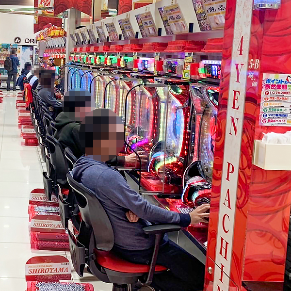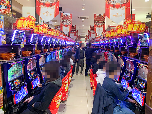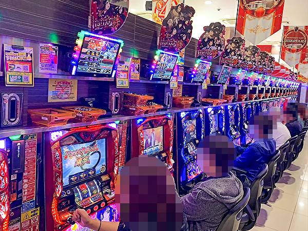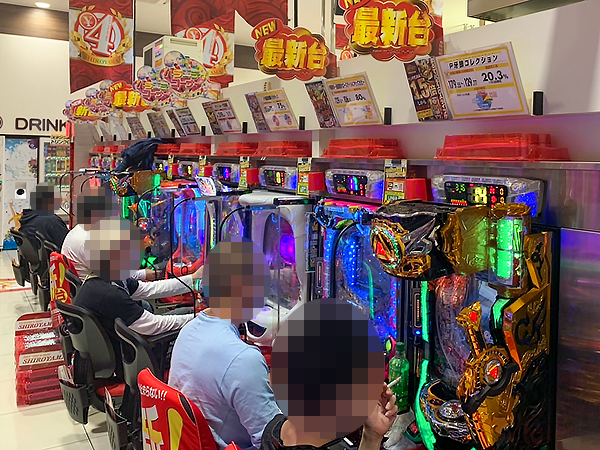 14時ごろの店内を見ると、20円パチスロの「パチスロ北斗の拳 天昇」や4円パチンコの「P忍者ハットリくん~決戦!サイバーからくり城の巻~中忍ver.」など、新台が全体的に満席だった。