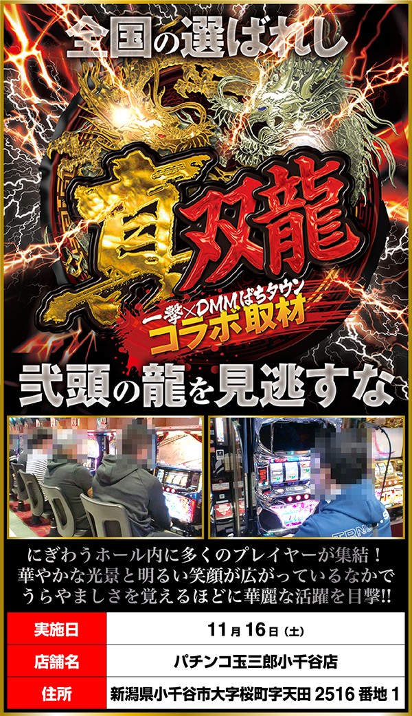 パチンコとパチスロを存分に楽しめる環境が整っている「パチンコ玉三郎小千谷店」で、たくさんの笑顔と出会えた「真双龍」となった。