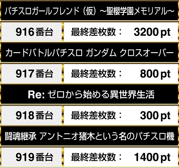 最終的には916番台の『パチスロガールフレンド(仮)~聖櫻学園メモリアル~』から919番台の『闘魂継承 アントニオ猪木という名のパチスロ機』までの4台が並んでプラスpt!!