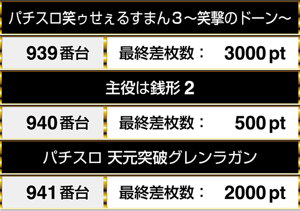 『パチスロ笑ゥせぇるすまん3〜笑撃のドーン〜』と『主役は銭形2』、『パチスロ 天元突破グレンラガン』は3機種を通してプラスptを記録した。