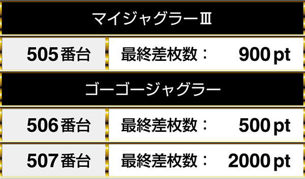 閉店時には1000ptオーバーを含めて3台が連なってプラスptを記録!