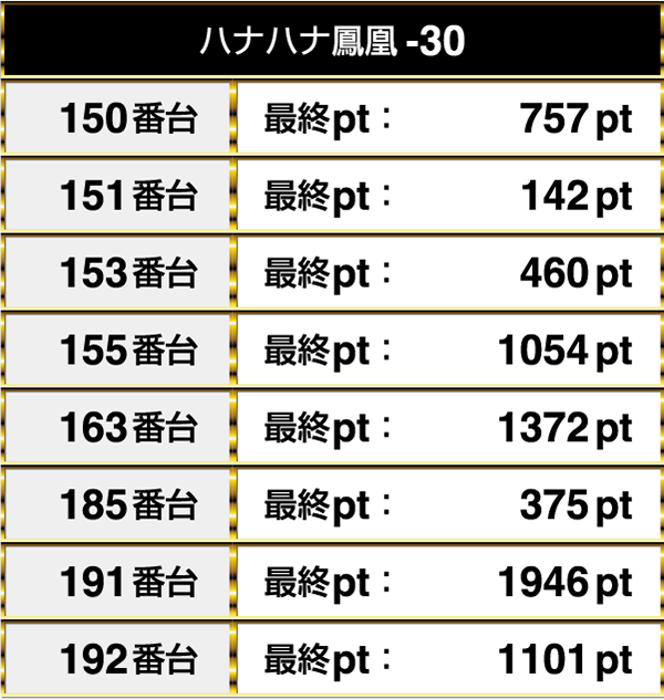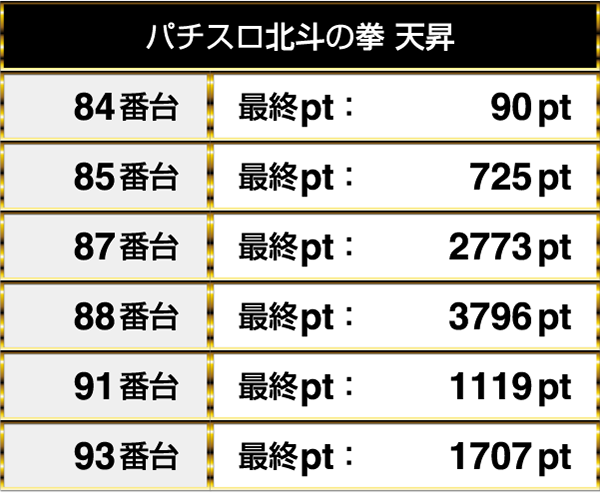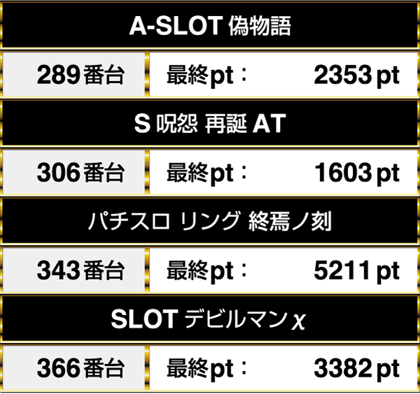 『A-SLOT偽物語』は2000pt以上であり、『SLOTデビルマンχ』においては3000ptを上回るデータが残っていた。