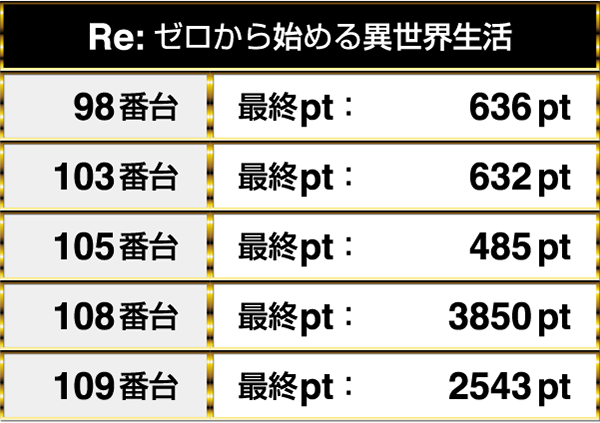 14台設置の『Re:ゼロから始める異世界生活』は3850ptを含め、5台がプラスptでこの日を終えていた。