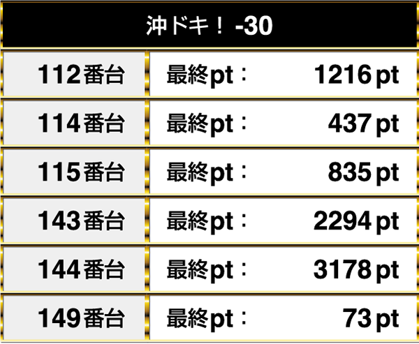 12台設置の『沖ドキ!-30』と11台設置の『パチスロ北斗の拳 天昇』は、5割がプラスptとなった。