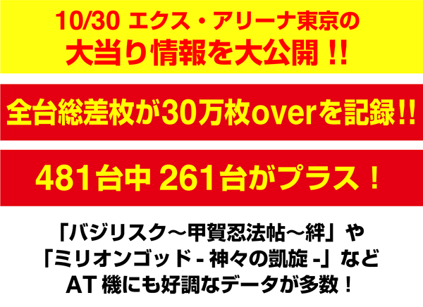 10月30日の「エクス・アリーナ東京」は、パチスロ全体で259台がプラス。トータル差枚数は316456ptを記録した。