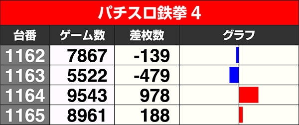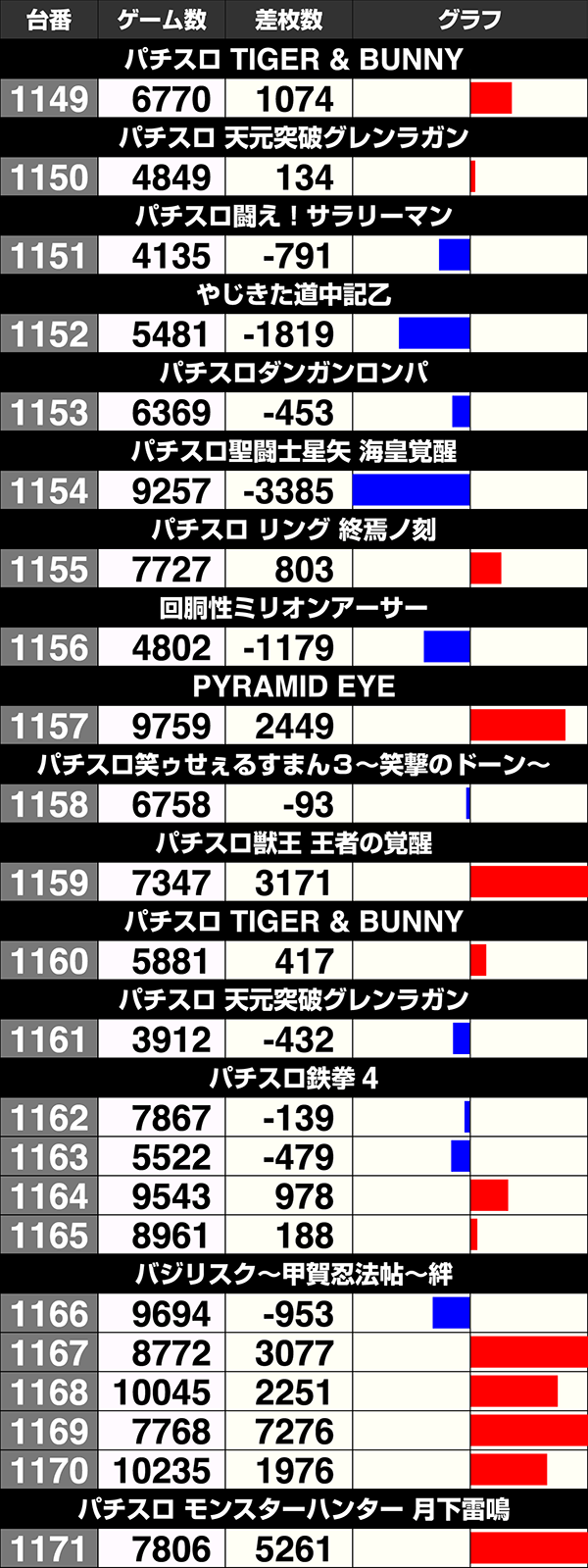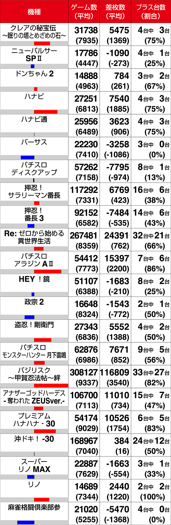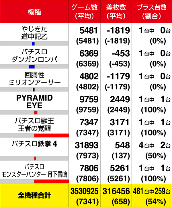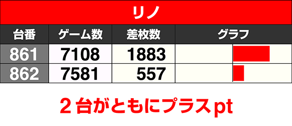 『リノ』、『パチスロ TIGER & BUNNY』、『GI優駿倶楽部』、『パチスロ リング 終焉ノ刻』の4機種は全台がプラスを記録した。