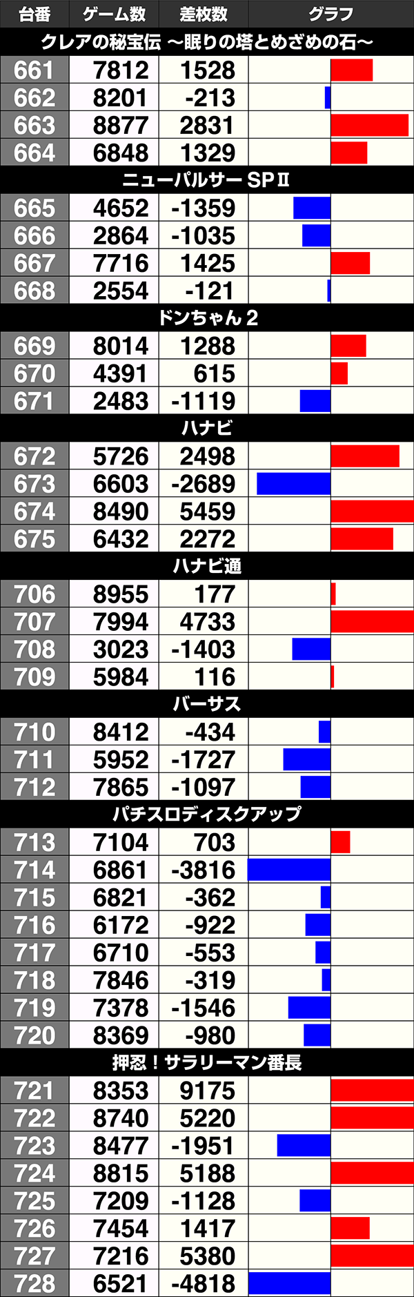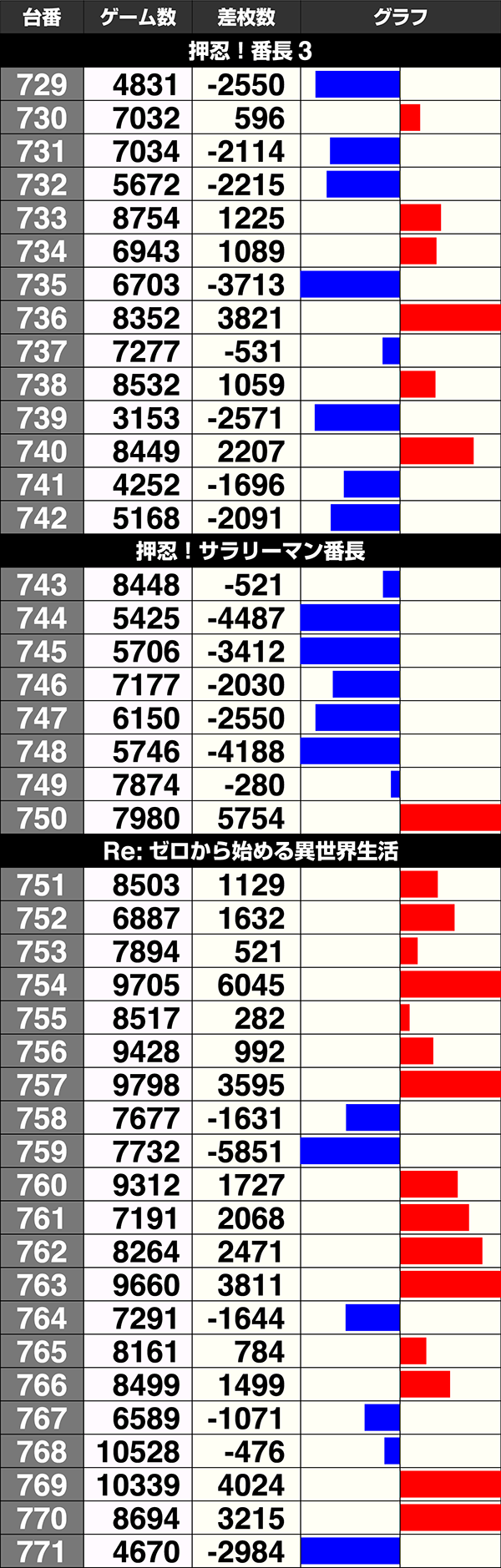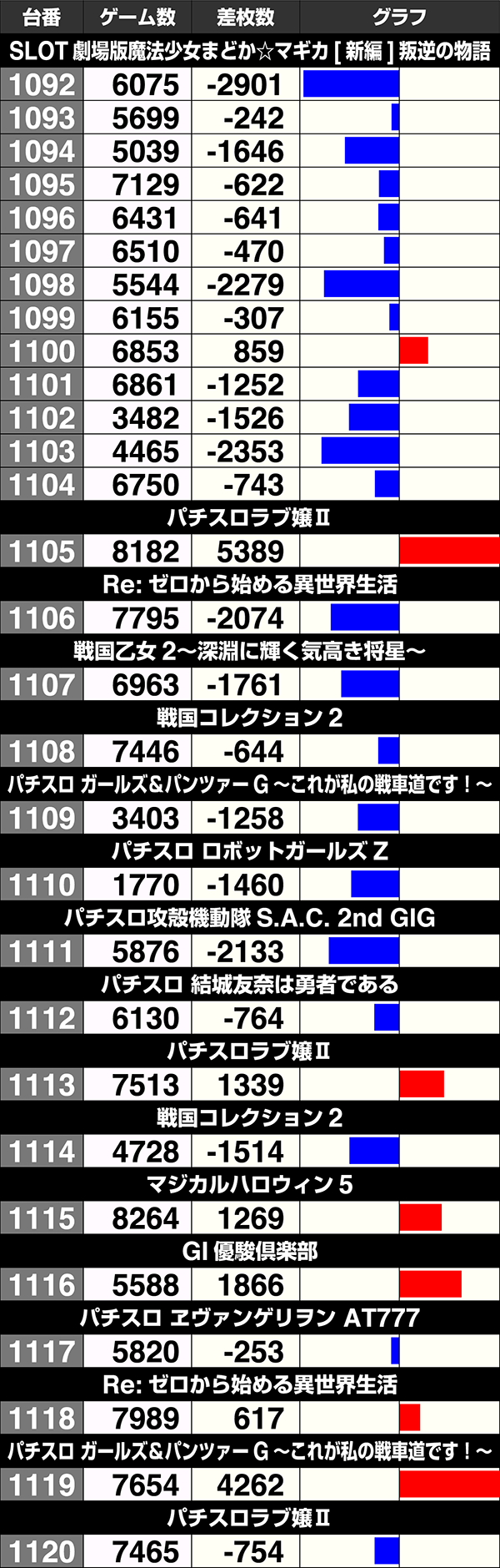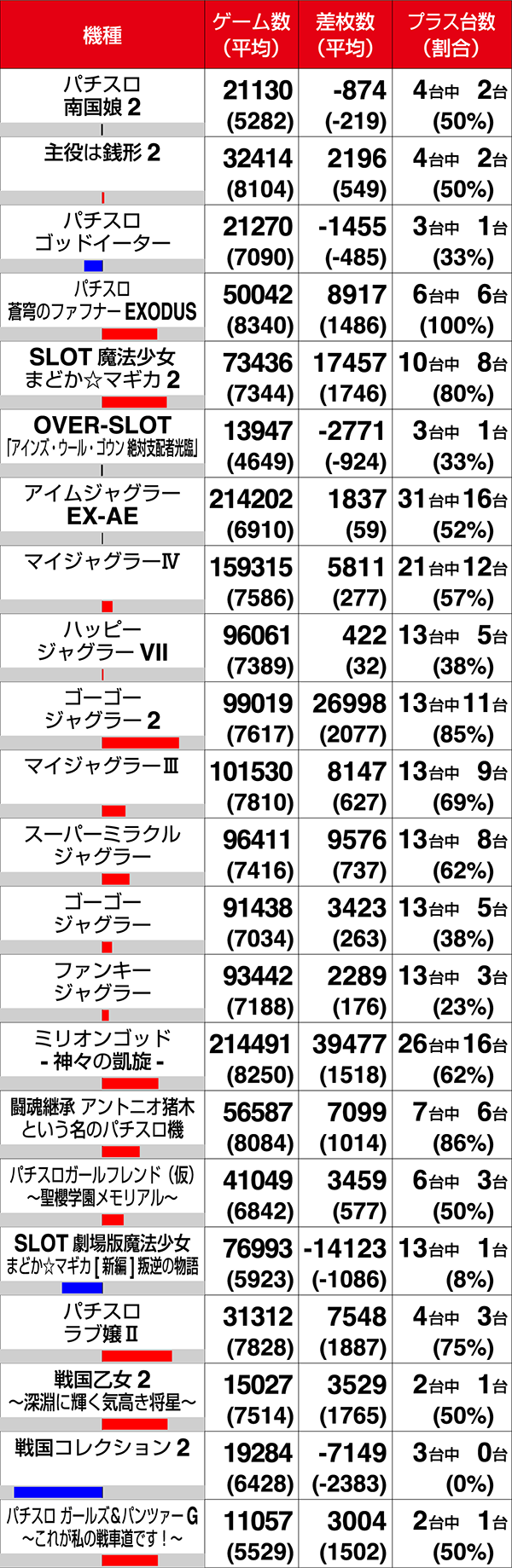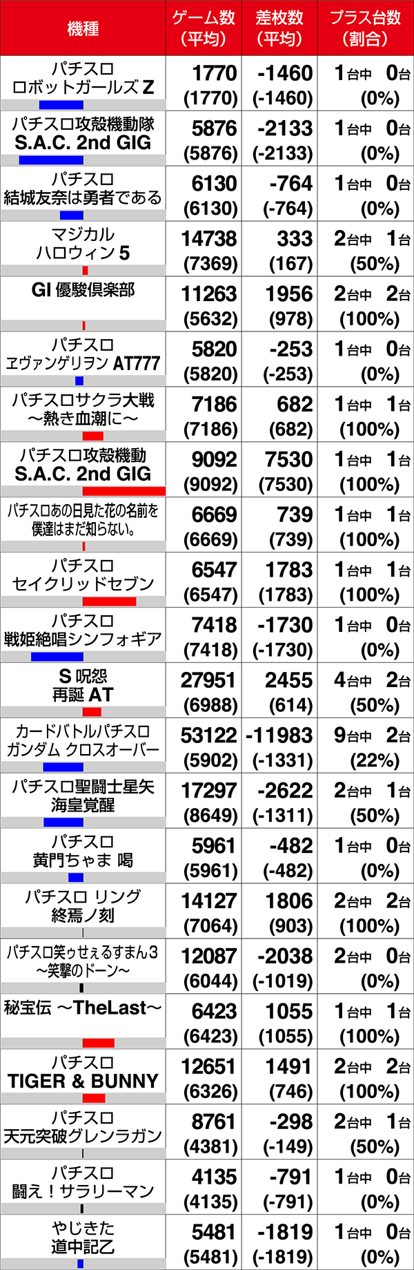 『パチスロ 蒼穹のファフナーEXODUS』が6台すべてがプラス、『闘魂継承 アントニオ猪木という名のパチスロ機』は7台中6台がプラスと新機種のプラス割合も高い。