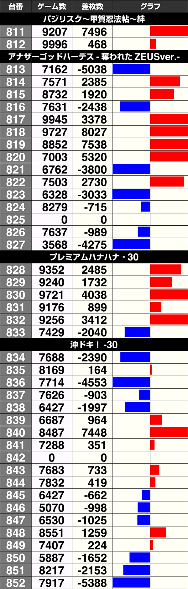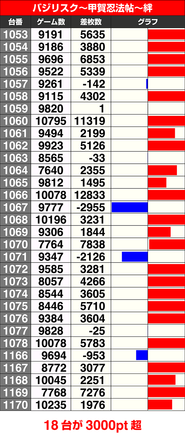 33台中28台がプラスを記録した『バジリスク~甲賀忍法帖~絆』は10台が5000ptを上回り、そのうちの2台が10000ptを超えた。
