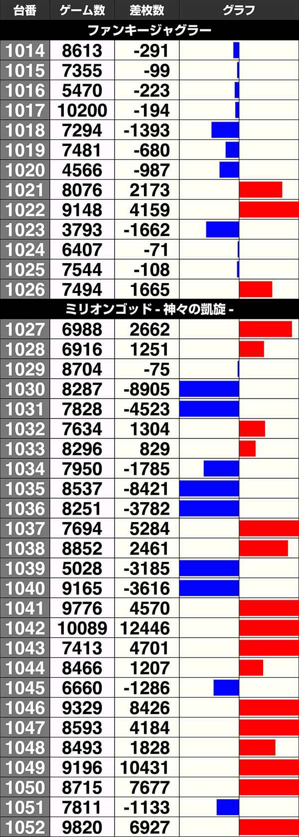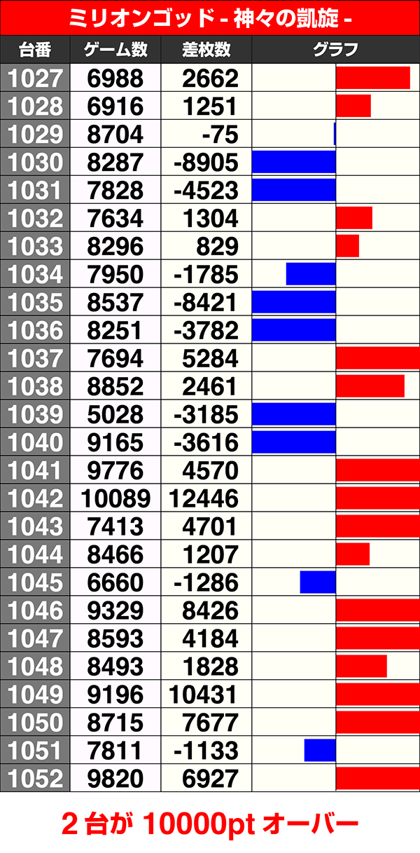 『ミリオンゴッド-神々の凱旋-』も2台が10000pt超。トータルでは16台がプラスを記録した。