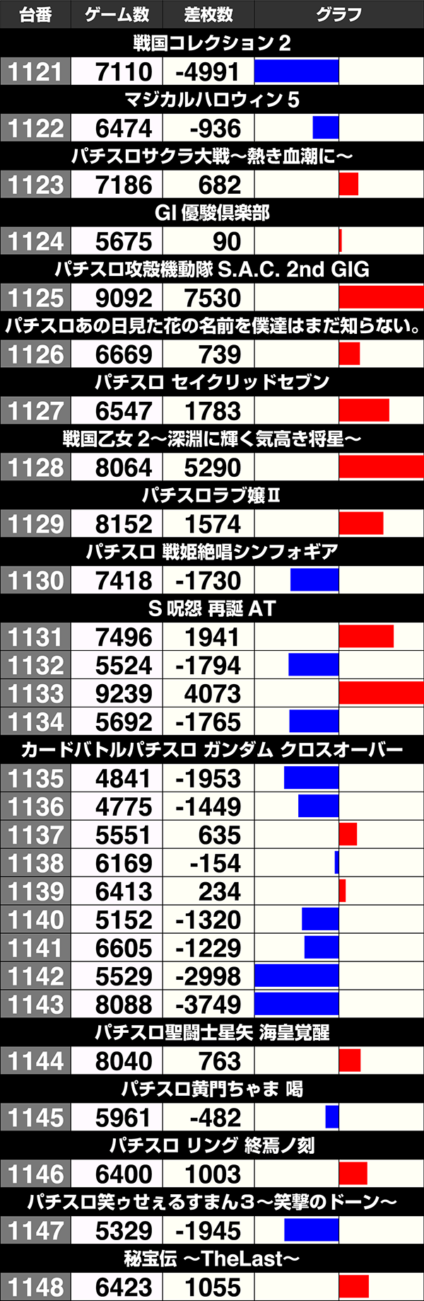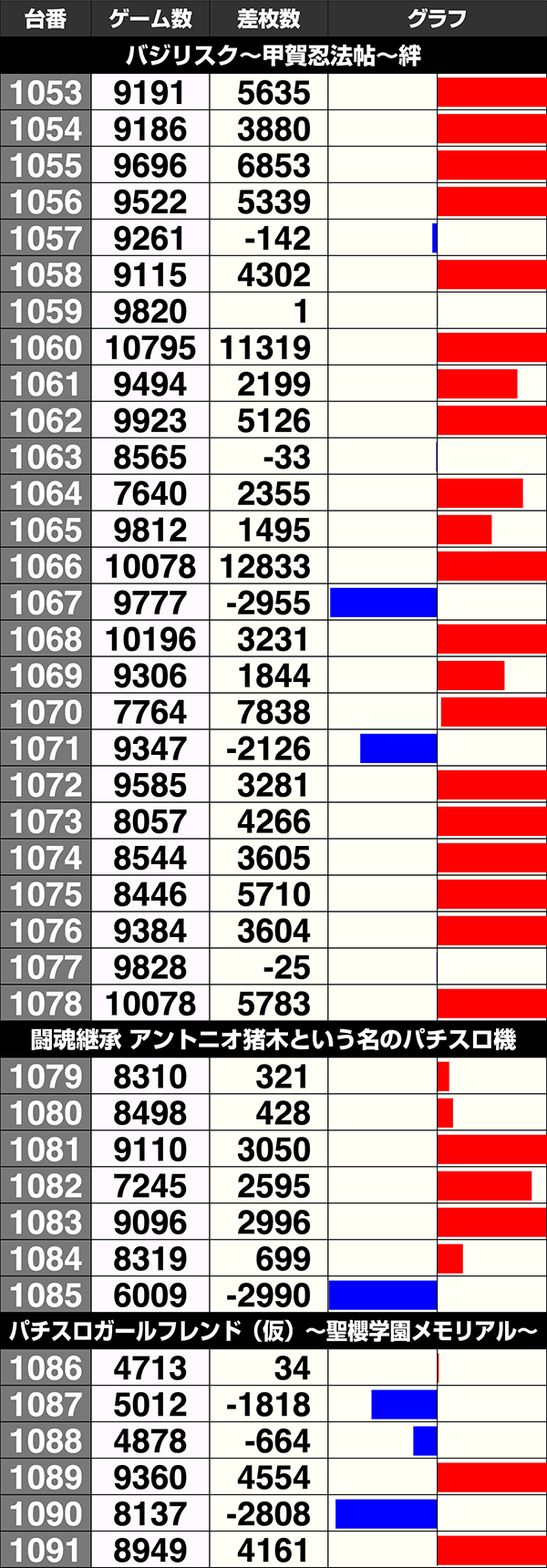 8機種が合計差枚数10000ptオーバーで、『バジリスク~甲賀忍法帖~絆』の差枚数はトップの116809pt。