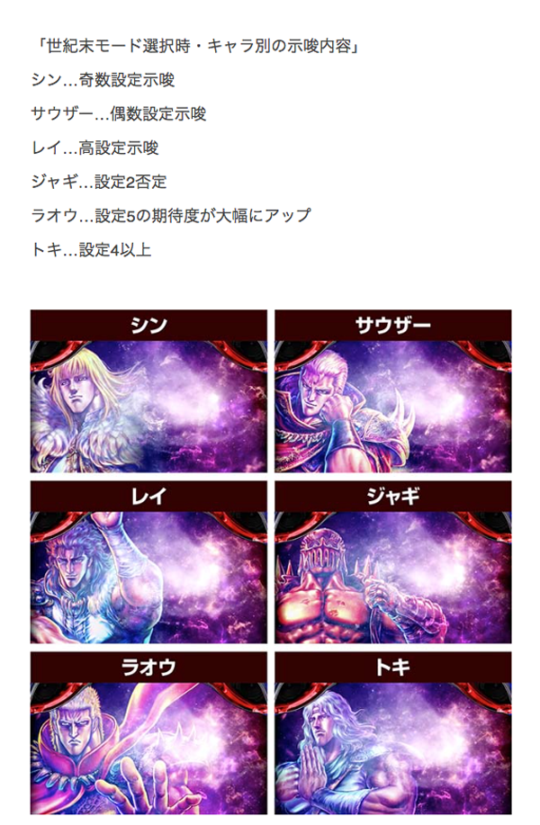真・天昇ラッシュ終了画面では全リール停止後にPUSHボタンを押すと、キャラが出現。修羅モード選択時はバット、世紀末モード選択時はトキであれば設定4以上が濃厚だ。