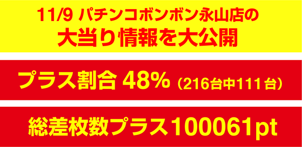 11月9日の「パチンコボンボン永山店」は、パチスロ全体で216台中111台がプラス。