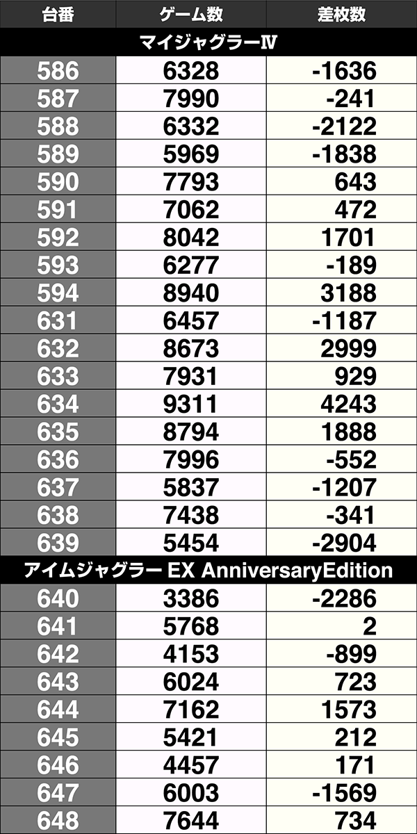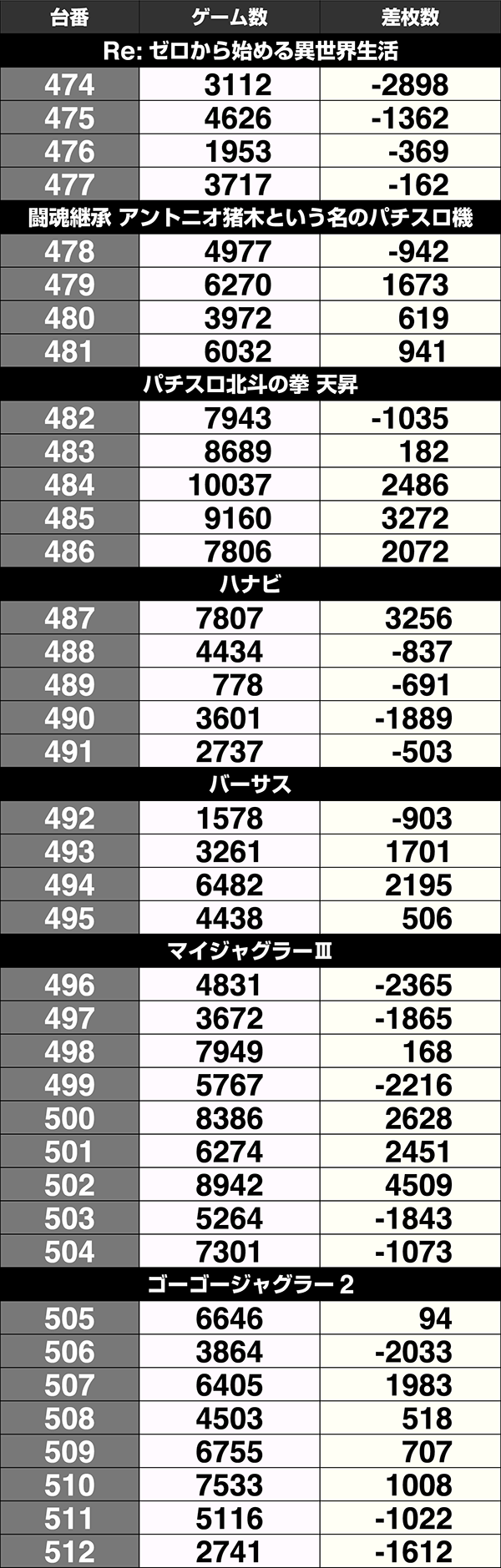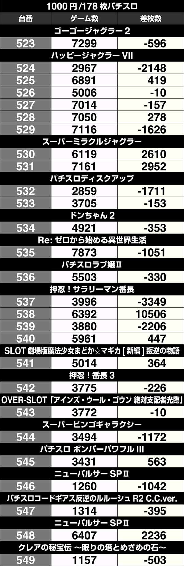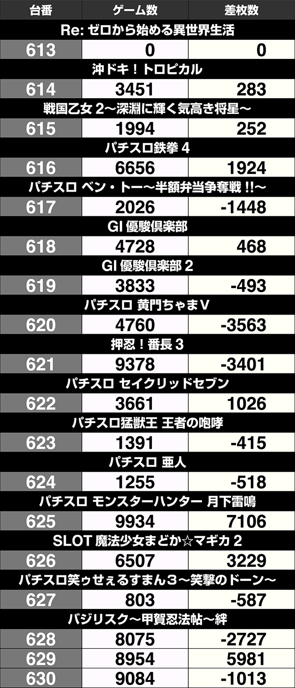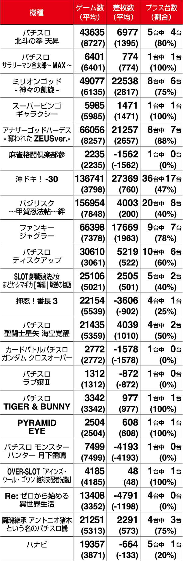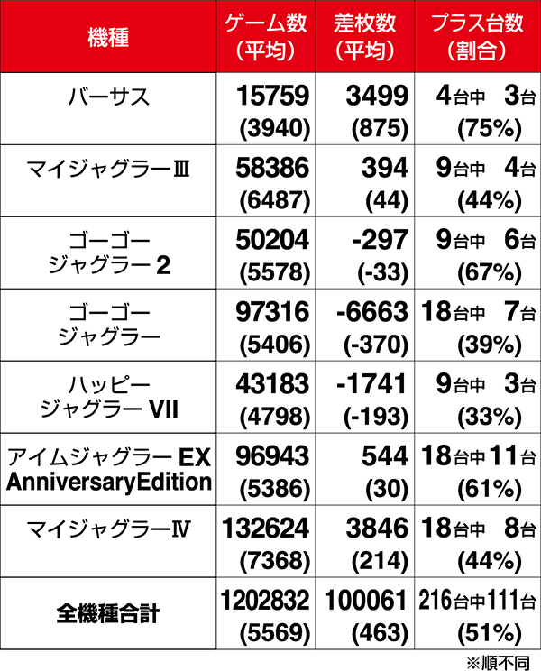 設置台数が1台のみの機種は9機種中5機種がプラス。2台以上設置されている機種は20機種あり、14機種の差枚数がプラスであった。