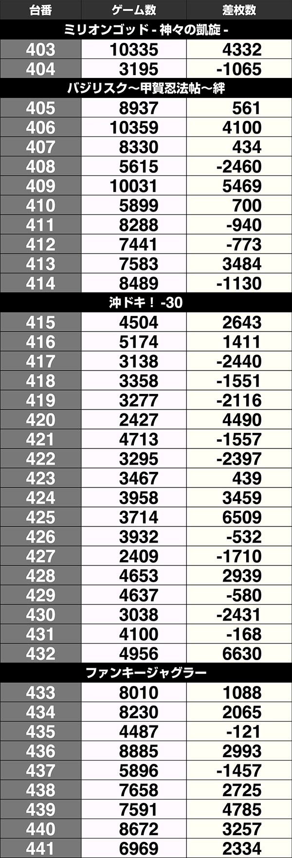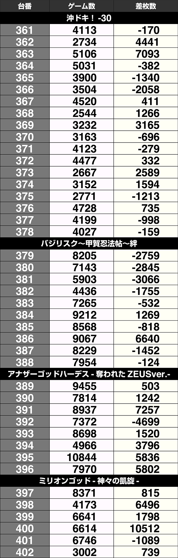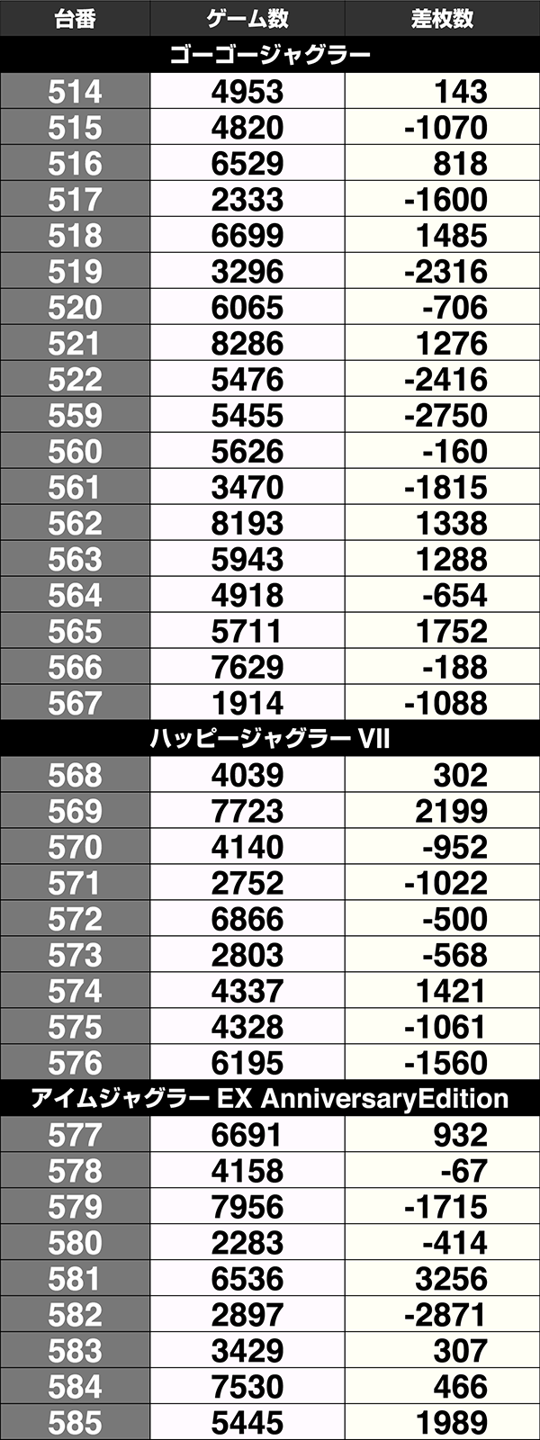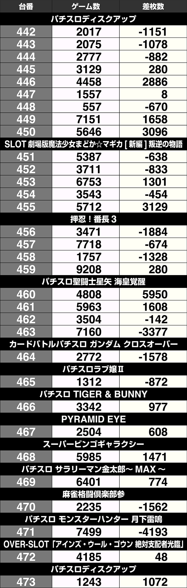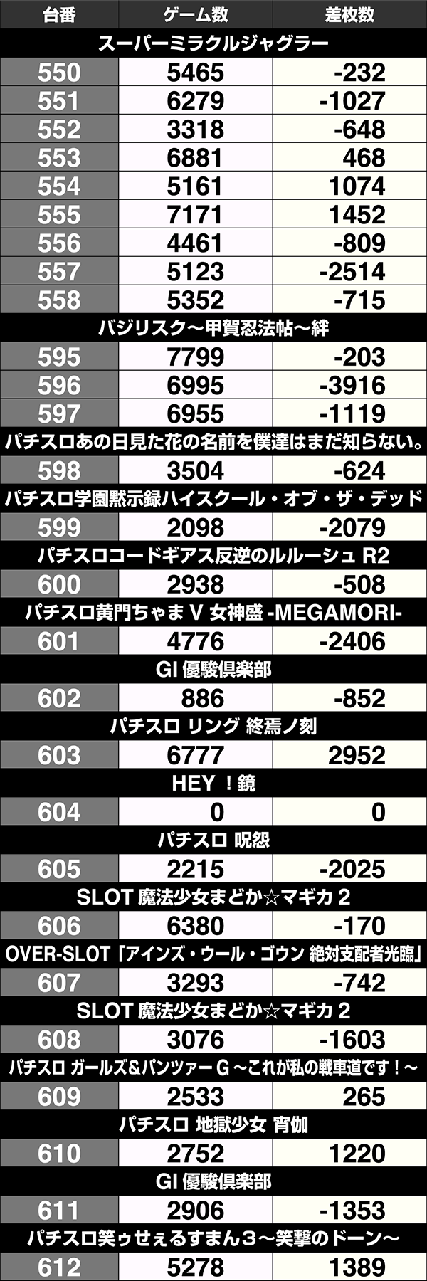設置台数が1台のみの機種は9機種中5機種がプラス。2台以上設置されている機種は20機種あり、14機種の差枚数がプラスであった。