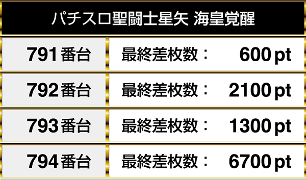 5台設置の『パチスロ聖闘士星矢 海皇覚醒』は4台並びでプラスptとなり、1台が6700ptを記録!