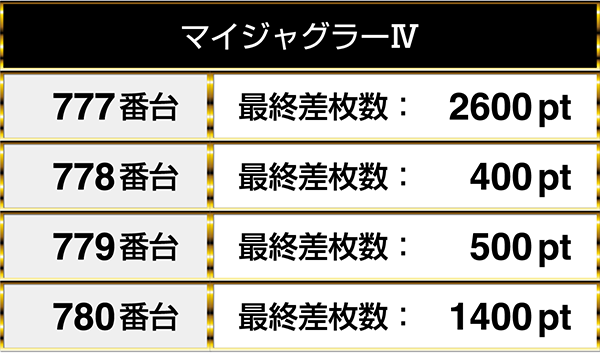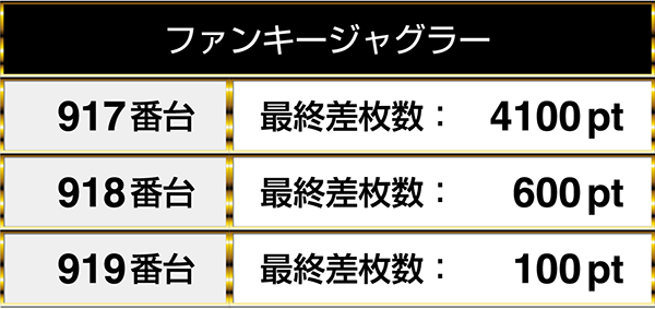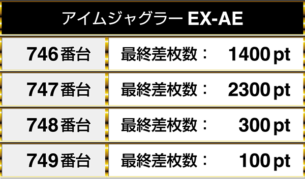 閉店時には『アイムジャグラーEX-AE』と『マイジャグラーⅣ』が4台並び、『ファンキージャグラー』は3台が連なってプラスptを記録。どの機種にも2000ptを上回る台があった。