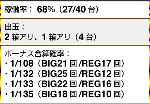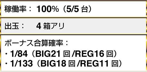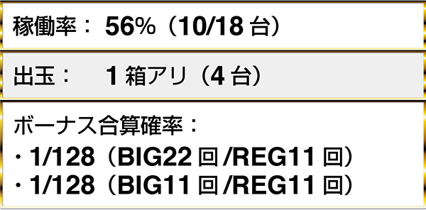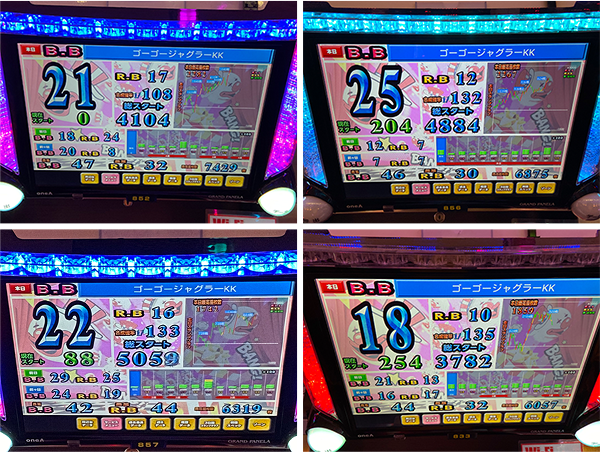 ジャグラーシリーズでは、『ゴーゴージャグラー』や『マイジャグラーⅢ』、『アイムジャグラーEX-AE』など、3機種以上でボーナス合算確率が1/130を上回るデータがみられた。