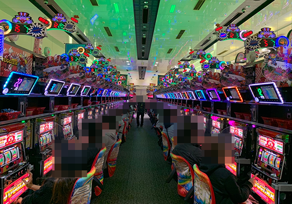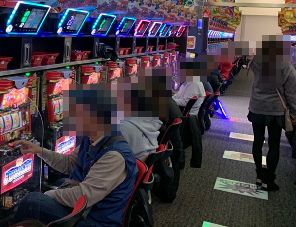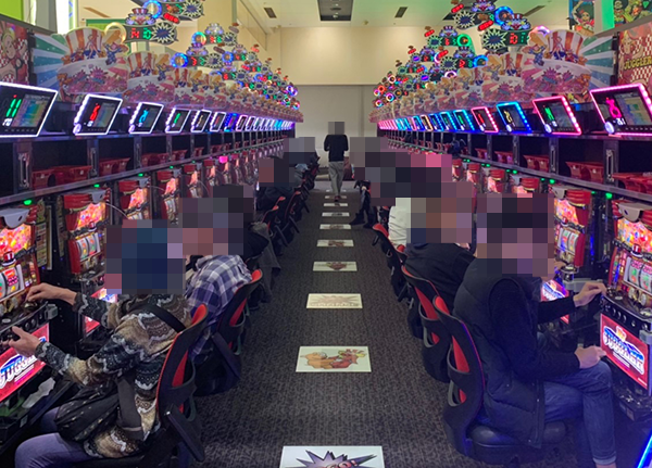 多くのプレイヤーが遊技をおこなっているにぎやかな光景は、パチスロコーナー全体でみてもひときわ目立っていた。