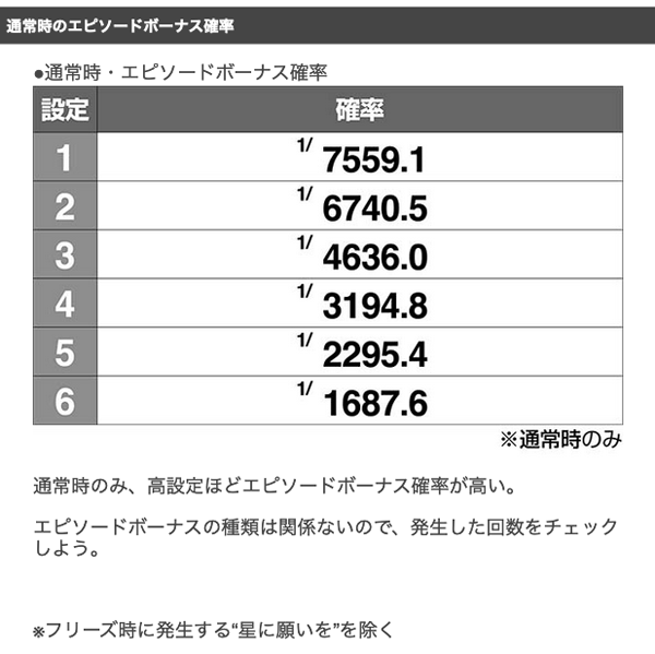通常時のエピソードボーナス確率に設定差があり、高設定ほど高い。