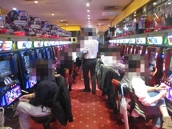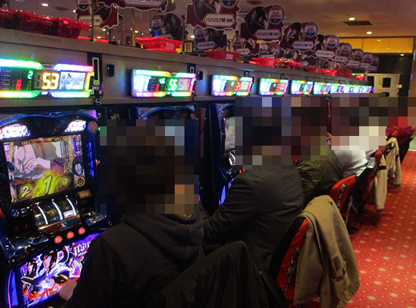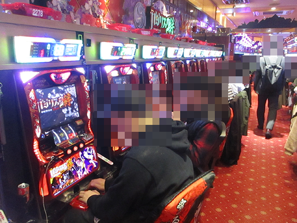 にぎわいがおとろえず、いつみてもうれしそうに遊技をおこなう姿があった「バジリスク~甲賀忍法帖~絆」。ホール全体の稼働率が下がることもなく、退店するときまでパチンコとパチスロの両方が大きな盛り上がりをキープしていた。