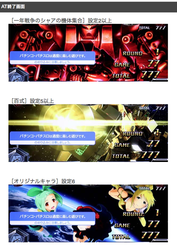 AT終了画面に設定を示唆する要素が存在。百式なら設定5以上、オリジナルキャラなら設定6が濃厚となる。