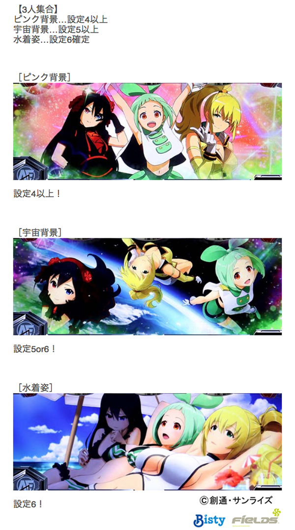 また、Xボーナス中のビタ押し成功時に発生するオリジナルキャラのカットインにも注目しよう。バストアップと口アップのパターンがある1人は、キャラごとで奇偶と高設定を示唆。3人であれば高設定が濃厚となり、水着姿は設定6が濃厚だ。