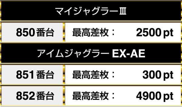 となりにある『アイムジャグラーEX-AE』には前回と同様にプラスptが並び、最終的には850番台から852番台が連なってプラスpt!