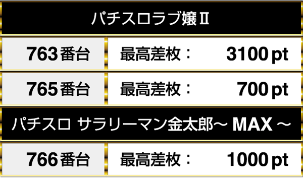 『パチスロ サラリーマン金太郎~MAX~』の766番台をあわせると、3台が並んでプラスptとなった。