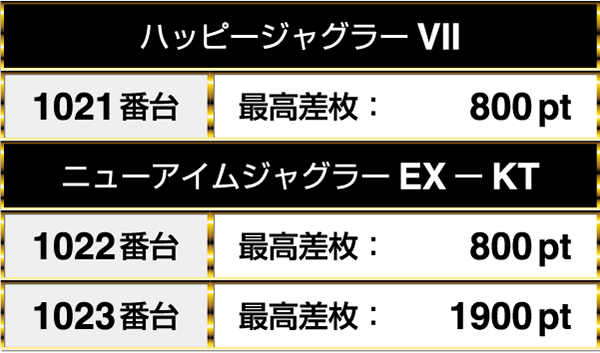 『ハッピージャグラーVⅡ』と『ニューアイムジャグラーEXーKT』は2機種を通して3台並びでプラスpt!!