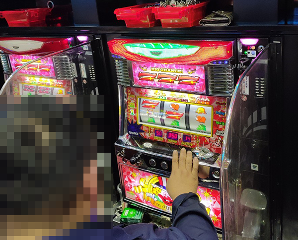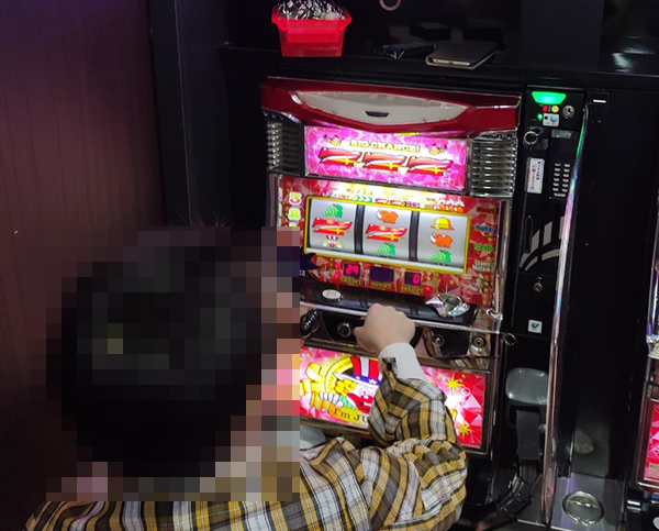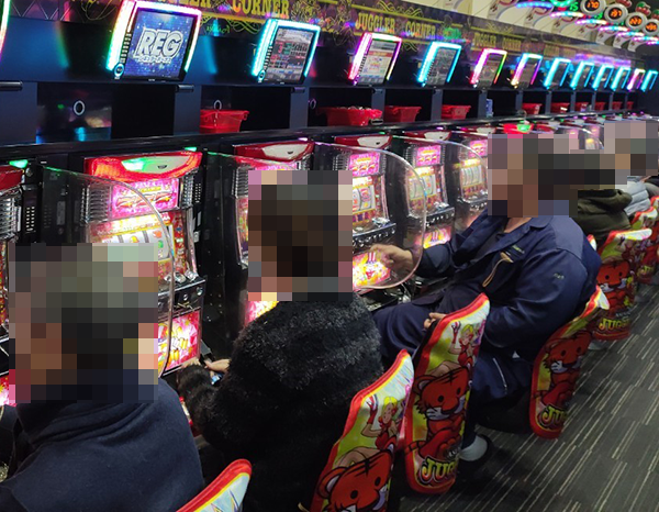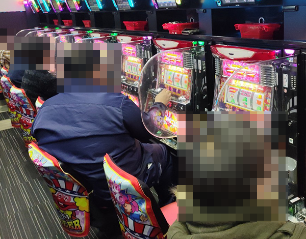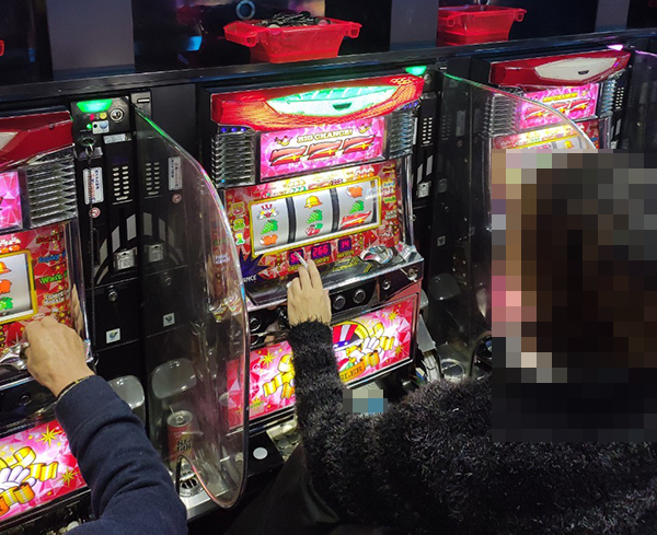 さまざまなプレイヤーが遊技をおこなっている店内を進んでいくと、「ニューアイムジャグラーEXーKT」でイキイキとレバーを叩いている姿に目をひかれた。