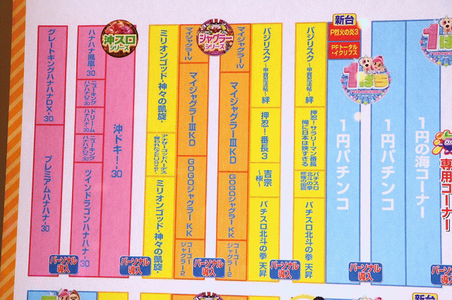 4円パチンコ400台、1円パチンコ320台、20円パチスロ280台、5円パチスロ40台、新旧織り交ぜた計1040台を設置。