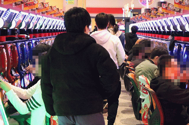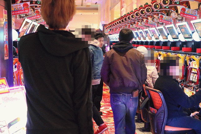 先頭集団の後を追うと、一直線にパチスロコーナーへと向かっている。