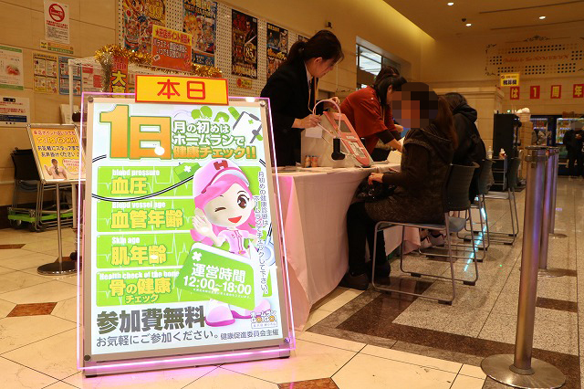 さらにさらに! 月の始め、つまり1日には健康相談会を実施。参加費無料で血圧・肌年齢・血管年齢・骨の健康チェックを受けることができるぞ。